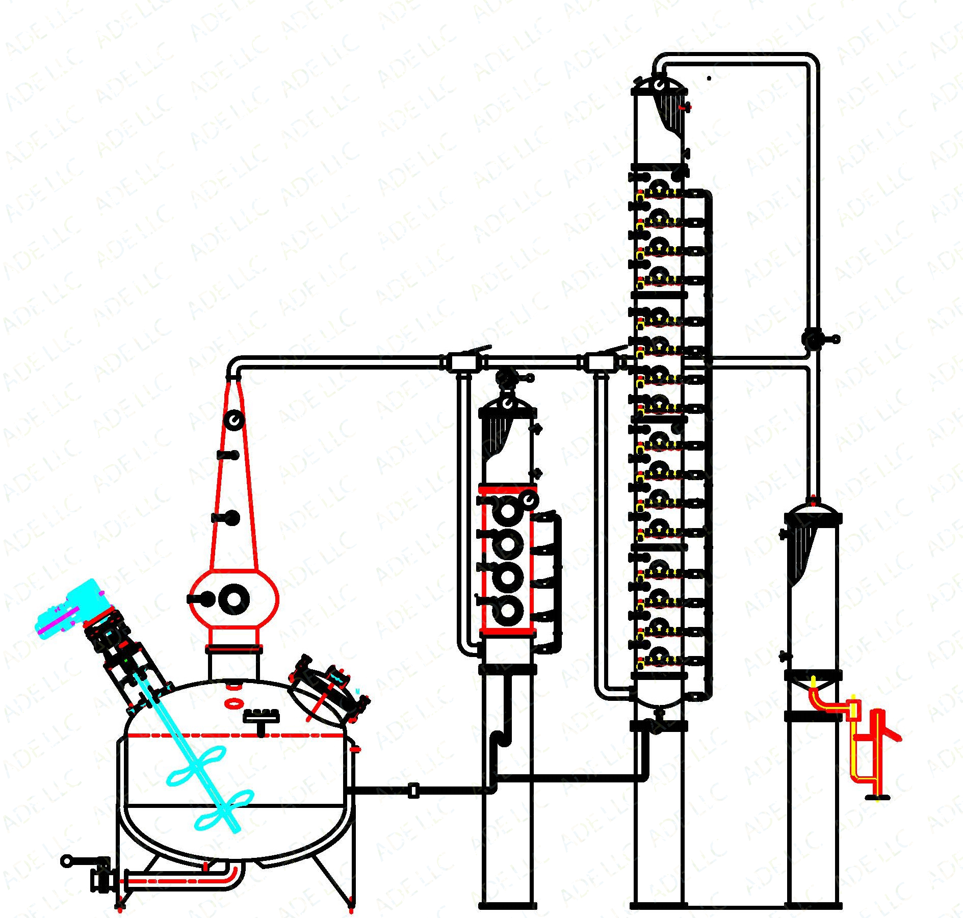 The drawing above is of our 200 gallon Jacketed, Steam Heated, Pro Series Vodka Stills. This still will produce great Whiskey, Vodka and everything in between. This Still comes with 1 Copper Column and 1 Stainless Column. The individual Plate Drain Valves in the 4 Plate Copper Whiskey Column can be opened or closed allowing for better control of flavor profiles and proof. The Dephlegmator at the top of the Whiskey Column is used to Control Proof. The 10" Diameter Stainless Steel Vodka Column has 12 bubble plates and a Dephlegmator in the top. This Still will produce 190 proof Vodka in 2 Runs. The 4 plate Whiskey Column will produce up to 160 proof in 1 run. If you want to do a stripping run, you simply open the Plate Drain valves and the plates in the Copper Whiskey Column and you bypass the Vodka Column or if you are doing a Vodka you open the bypass for the Vodka Column and you run the Vapor through both Columns. This 200 Gallon Still must be heated by a Low Pressure Steam Boiler. Click on the Low Pressure Steam Boiler link above to see them. This 200 gallon Still is 14' 7" tall. The width of the Still including the condenser is 15' 4". This Still is great for producing Whiskey, Bourbon, Moonshine, Brandy, Rum and Gin (with the optional Gin Basket) and Vodka. This 200 gallon Pro Series Vodka Still comes standard with: